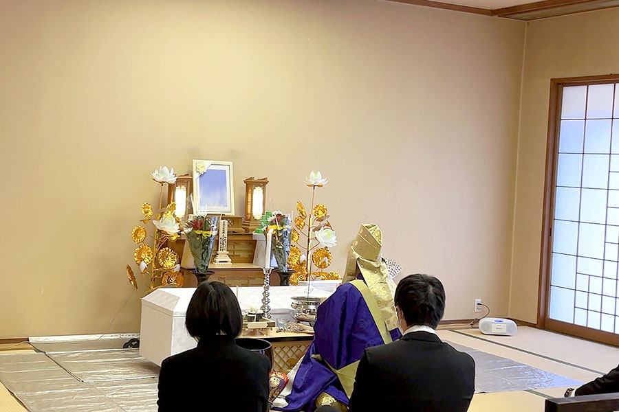 名のご家族のみのあたたかい葬儀になりました。施設内の座敷にて施工。